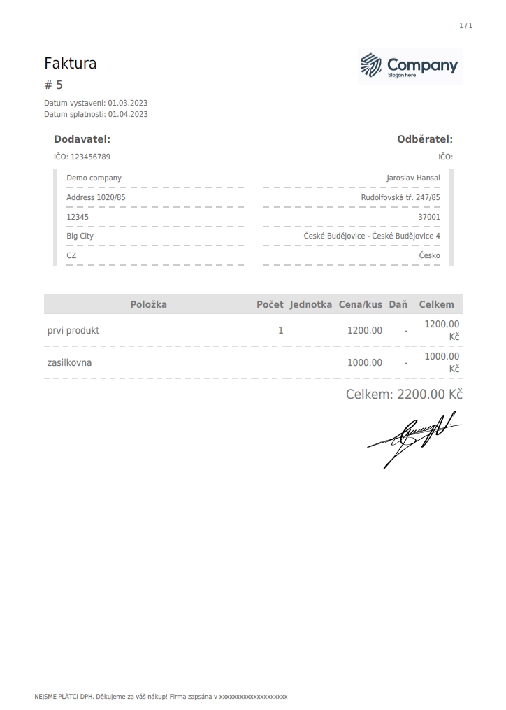 - Možnost plného nastavení podoby a textů faktury (fakturační údaje, logo, podpis)